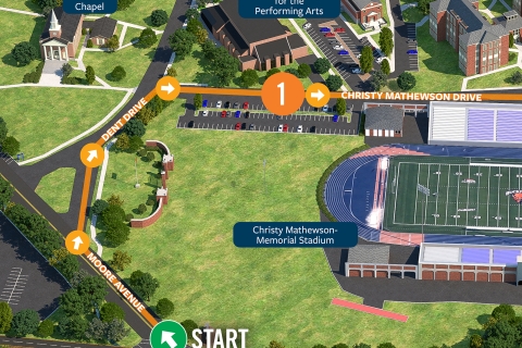 Comiencen su recorrido entrando al campus por la avenida Moore Avenue en la ruta 15 de Estados Unidos. En la bifurcación, giren a la derecha en Dent Drive. Giren a la derecha en el estacionamiento para visitantes que se encuentra entre el Weis Center for the Performing Arts y el campo de fútbol (Christy Mathewson-Memorial Stadium). Cuando hayan estacionado, pulsen el botón de reproducción en la Parada 1.