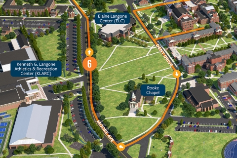 Indicaciones para la Parada 6: Salgan del estacionamiento y giren a la izquierda (sur) por Dent Drive. Al pasar, verán la capilla Rooke Chapel a su derecha. Giren a la derecha sobre Moore Avenue y encontrarán un lugar para estacionar por esta misma avenida.