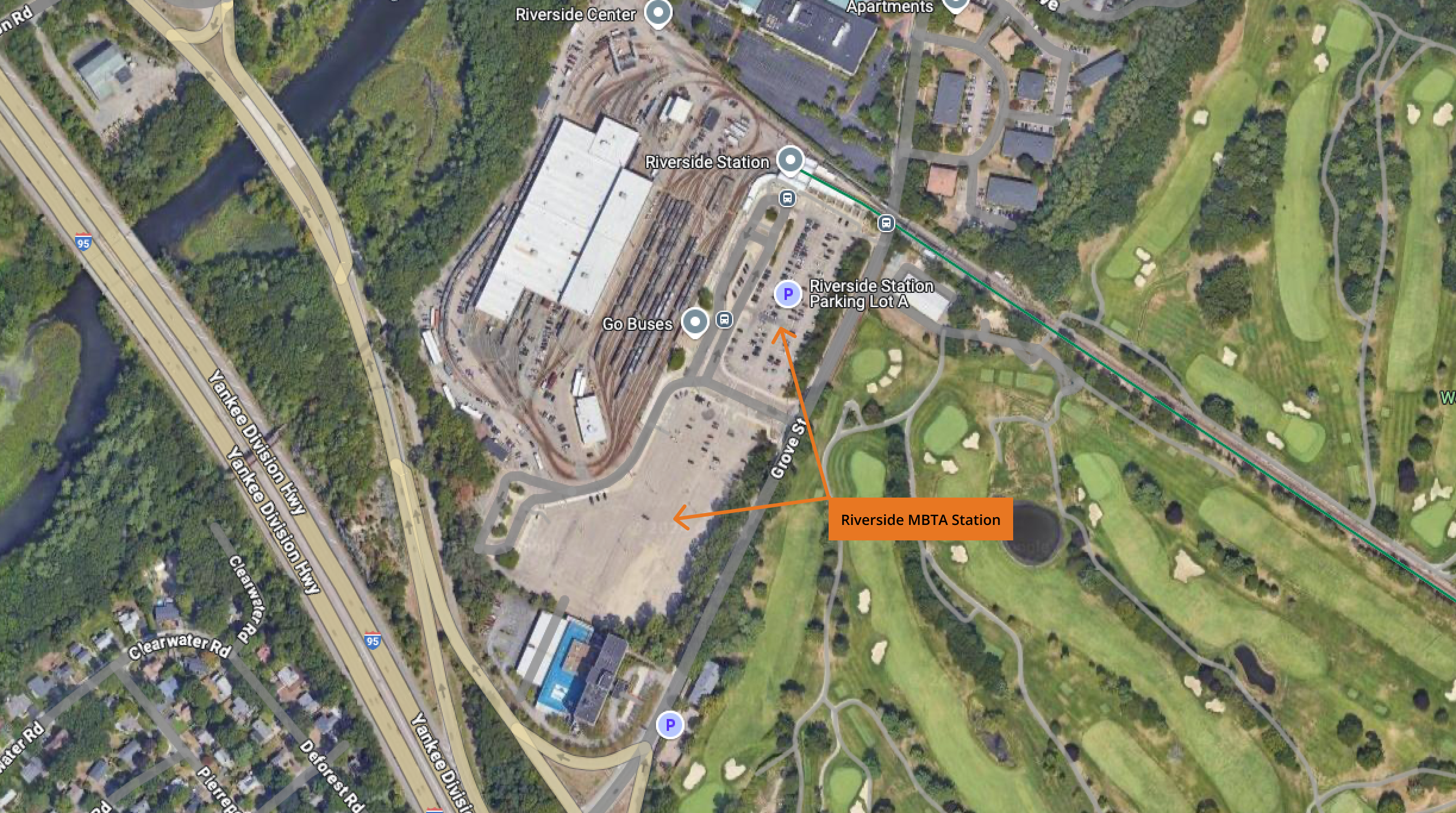 location of the Riverside MBTA Station shuttle stop in the parking lots to the west of Grove Street